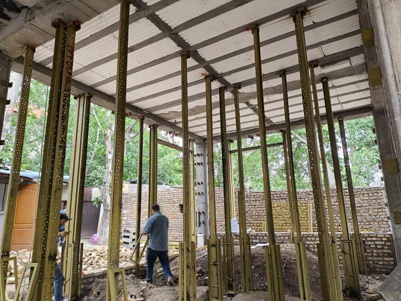 از آنجایی که در زمینهای کلنگی در گذشته گیاهان و درختان قدیمی وجود دارند، خاک در یک متر اول در اصطلاح خاک نباتی نامیده میشود و به دلیل بافت متخلخل دارای مقاومت ضعیفی است لذا خاکبرداری بیشتر از حجم مورد نیاز در زیر پی انجام شد تا با عبور از لایه خاک نباتی به خاکی با مقاومت مناسب برسیم سپس با لاشه چینی و اجرای توامان سنگ و ملات، لایه مستحکمی در زیر پی ایجاد کردیم که جایگزین لایه ضعیف خاک نباتی بود. در نهایت با اجرای بتن مِگر بستر خاک برای اجرای پی نواری آماده گردید.
