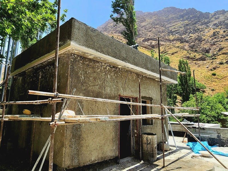 لازم به ذکر است در فضای محوطه باغ هم بناهایی مثل مخزن سپتیک، انبار، پارکینگ، موتورخانه و دیوار حائل رودخانه اجرا گردید که به اضافه شدن فضاهای مفید باغ کمک شایانی کرد. البته با توجه به خصوصیات اقلیمی و آب وهوایی فشم در طول مدت ۱.۵ ساله پروژه حداقل ۵ تا ۶ ماه به دلیل بارش برف و وخامت اوضاع جوی کار به کندی پیش رفت که از اقتضائات کار در مناطق ییلاقی اطراف تهران است. اقلیمی و آب وهوایی فشم در طول مدت ۱,۵ ساله پروژه حداقل ۵ تا ۶ ماه به دلیل بارش برف و وخامت اوضاع جوی کار به کندی پیش رفت که از اقتضائات کار در مناطق ییلاقی اطراف تهران است
