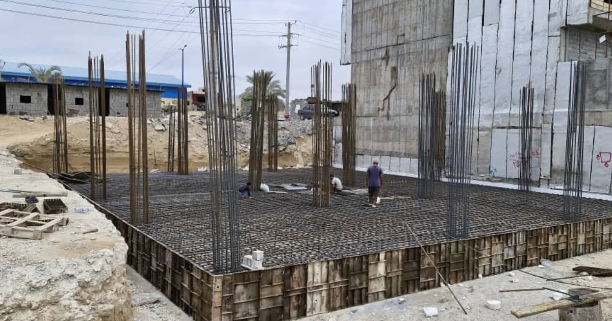بعد از اخذ جواز در پایان آبان ماه، تجهیز کارگاه و عملیات خاکبرداری در آذر ماه آغاز شد. خاکبرداری باید تا رسیدن به سطح مرجانی و دارای استحکام لازم انجام میشد و سپس خاکریزی و کوبیدن هر لایه خاک تا کمتر از یک متر انجام شد تا مهندسین اجرا از رسیدن به بستر مناسب زیر پی اطمینان حاصل کنند. سپس کار آرماتوربندی و بتن ریزی فونداسیون انجام شد. ستونهای پارکینگ هم قبل از عید نوروز بتنریزی شد اما شهرداری قشم از بتنریزی سقف اول به دلیل تقارن با تعطیلات هفته آخر سال ممانعت کرد.